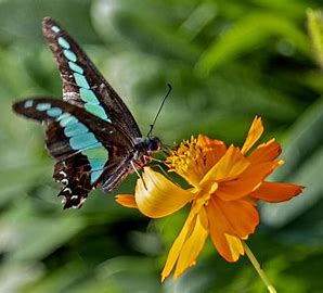 点击这里欣赏更多蝴蝶图片体型较大,飞行优雅,色彩艳丽。 后翅通常有突出的尾状突起,形似燕尾。 代表种类: 金凤蝶(Papilio machaon):分布广泛,黄色与黑色相间。 青凤蝶(Graphium sarpedon):翅膀有美丽的蓝绿色斑纹。